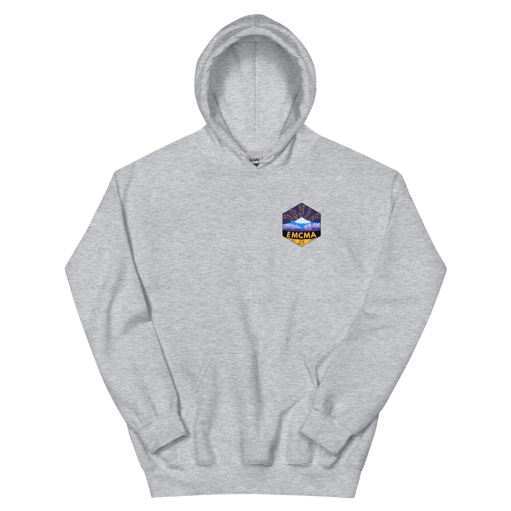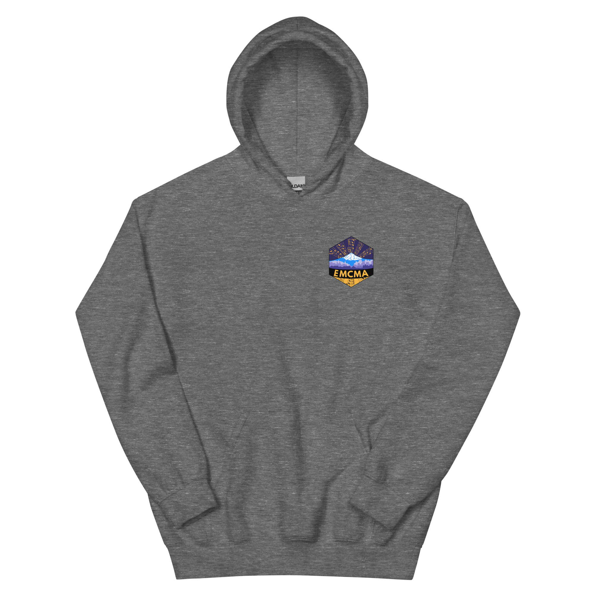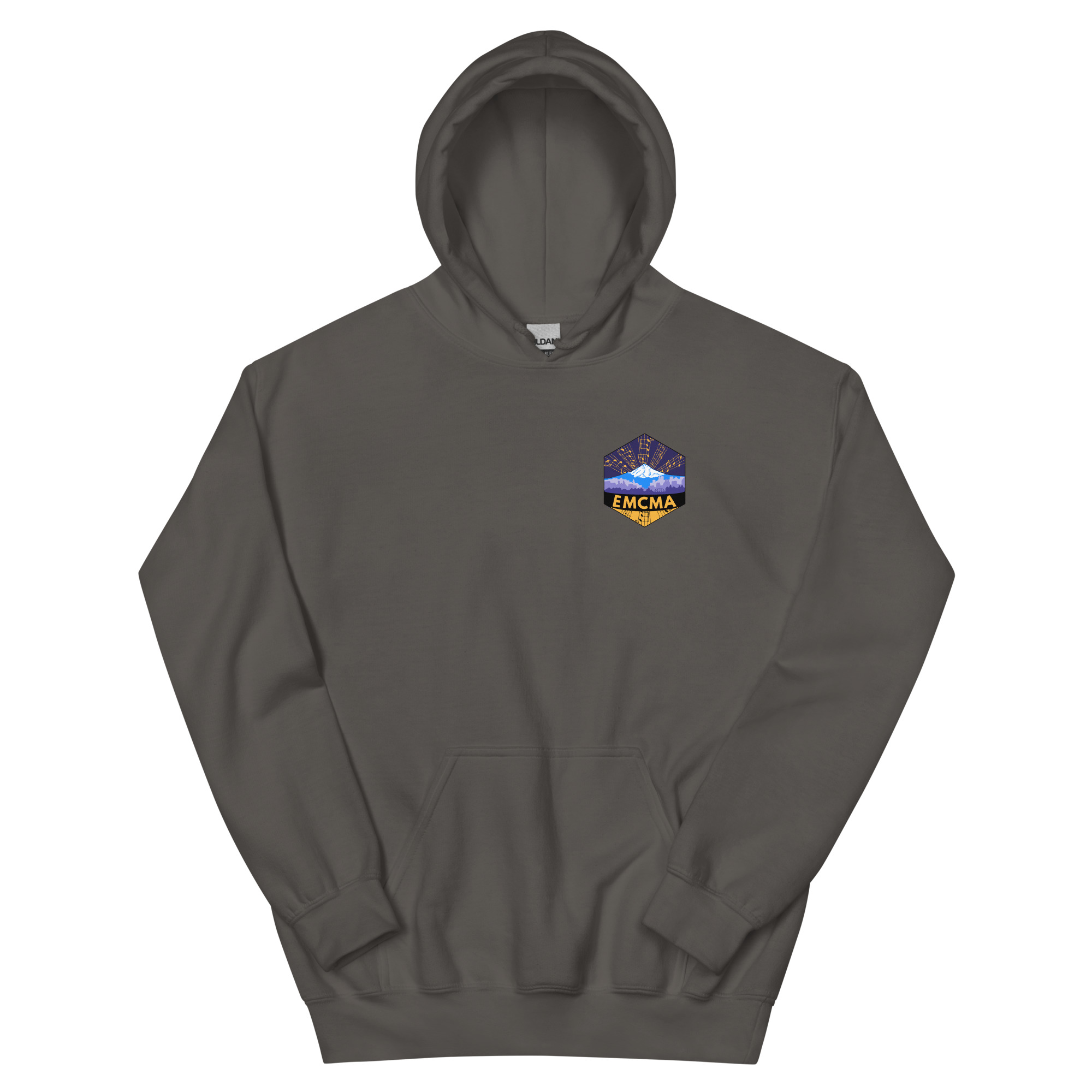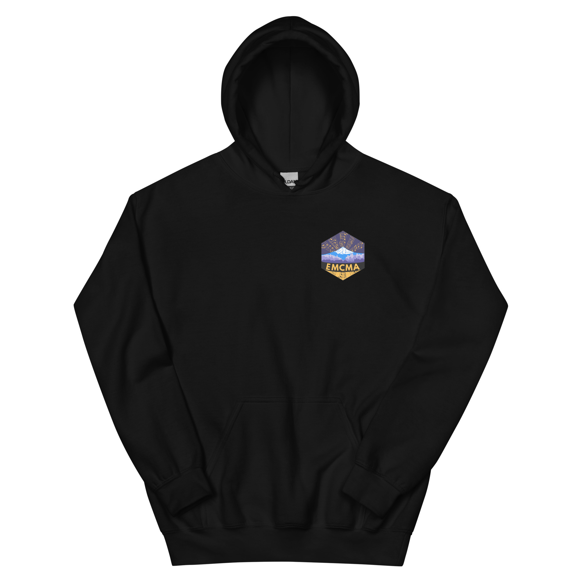 Solid-color hoodie with the EMCMA logo on the front left chest.